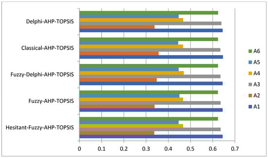 The author of the planned study chose six options to test. Comparing the outcomes of several approaches allows for a better understanding of the differences in numerical assessment in various ways. To assess the usefulness of the projected technique, the authors matched it to the other four MCDM techniques: fuzzy AHP-TOPSIS, classical AHP-TOPSIS, fuzzy ANP-TOPSIS, and classical ANP-TOPSIS [,,,]. Although hybrid procedures, such as fuzzy AHP-TOPSIS and fuzzy ANP TOPSIS produce noble outcomes, hesitant fuzzy AHP TOPSIS proves to be the most precise in the present example. The outcomes of the comparison were not as varied and dissimilar as they may have been, but the accuracy of the results varies.