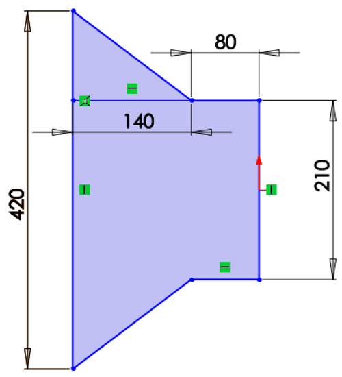 - It can be seen from the comparison between the outer convex and inner concave schemes that the velocity at the center of the outer convex air duct is large (Figure 5a), occupies most of the area of the outlet, and the maximum area of velocity distribution is about 4.2 m/s. The velocity at the center of the concave air duct is small (Figure 6a), about 3.90 m/s, and the velocity at the outer ring is about 4.0 m/s. The velocity distribution increases along the radial direction of the circle, which will have a certain impact on the safety of the blade. As shown in Figure 9, the thickness change of the front section of the blade first increases and then decreases along the radial direction. The thickness at the blade tip is the smallest, but at this time, the wind speed is the largest, and the safety of the blade will decline rapidly.