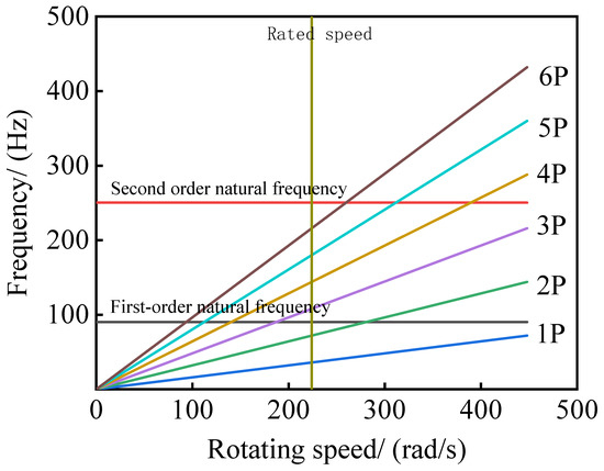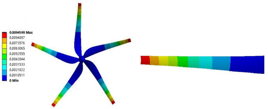 - The overall displacement of the blade is small and increases gradually along the radial displacement of the blade. The maximum displacement change occurs at the blade tip, the maximum displacement is 0.00946 mm, and the displacement at the blade root is small;