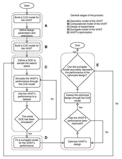 - (E) Wind turbine optimization: the optimization process for the wind turbine design using the surrogate model and metaheuristic optimization algorithms is executed.