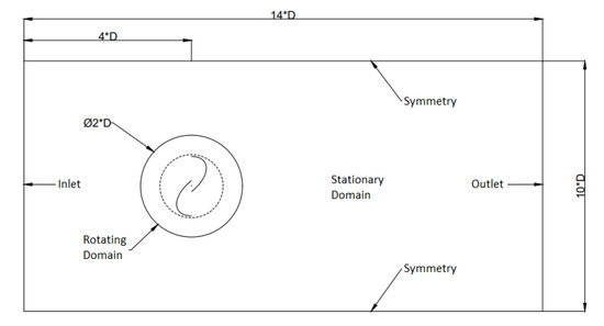 The simulation space has two computational domains: a rectangular prismatic domain to limit the total domain of the air within, called the stationary domain, and a cylindrical domain that surrounds the geometry of the Savonius wind turbine, called the rotating domain. Figure 3 illustrates the dimensions corresponding to these domains as a function of the rotor diameter and the respective contours intended for the inlet and outlet of the airflow. The simulation is set for the wind to flow from the inlet contour at constant speed and interacting with the Savonius VAWT on its way to the outlet contour, while the symmetry contours are set simply as symmetric side walls dedicated to contain the airflow within the stationary domain. It is worth mentioning that the height of both domains corresponds to four times the height of the rotor.