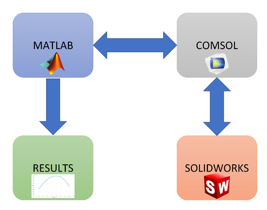 For this, a client-server type link is established between Matlab and Comsol Multiphysics and a direct link between Comsol Multiphysics and SolidWorks; in this way, the three platforms are perfectly integrated, with Matlab being the base platform from which the others are driven. Figure 4 shows a diagram of the interaction between the different integrated computing platforms.