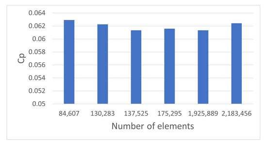 Figure 6 shows a variation in the model’s output of less than 0.3% in terms of as the number of mesh elements increases considerably. Therefore, the model has reached convergence.