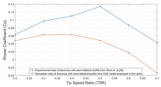 Figure 7 shows a direct comparison between the experimental data reported by [30], referring to the performance of a Savonius wind turbine with a semi-elliptical profile and the data calculated by the CAE model proposed in this work for a Savonius wind turbine with the same reported design at [30]. From this Figure, the good shape of the curve and good operating range of the wind turbine are observed. However, there is no precise correspondence in the since there is an average error of 0.0548; this indicates a tendency for the CAE model to underestimate the value of . However, since the CAE model presents good convergence in terms of the mesh, the CAE model, although built correctly, could be leaving out some physical phenomenon, such as the level of turbulence present in the flow of wind, which could cause this tendency to underestimate the .