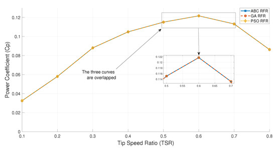 Table 11 groups the design parameters delivered by each optimization algorithm at the end of this process. It is important to note that, although the does not correspond to a design parameter of the wind turbine geometry, it is relevant to indicate the maximum performance point of a given design. However, the performance of each optimized design must be evaluated over the entire operating range of the TSR ( to ). Figure 8 shows the vs. curves corresponding to the optimized designs in Table 11, estimated by the RFR surrogate model. It is observed that the performance of the three designs is practically identical, as estimated by the surrogate model.