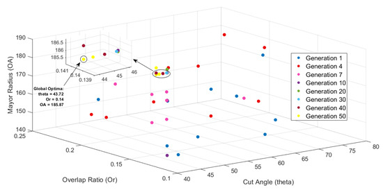In Figure 9, the evolution of the population through generations of the GA is shown, where each dot represents an individual or candidate solution and each color represents a different generation of the algorithm execution. It is clear that during the first generations the population is more spread; this happens because at the beginning the algorithm is doing more exploration on the search space, and this is illustrated by the blue, red, and pink dots on Figure 9, which are more separate from each other. However, from generation 20 onwards the individuals start concentrating at some local optima near the circled region on Figure 9 (green, cyan, and dark red dots), where finally a global optima is found at the last generation (yellow dots).