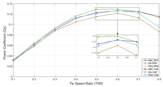 From the same Figure 10 and Table 12, it is observed that the design with the best overall performance in terms of is the one corresponding to the design delivered by the GA algorithm, which has a maximum of , while the design delivered by the ABC algorithm reaches a maximum of and the design delivered by the PSO algorithm reaches a maximum of , all at a TSR of , as calculated with the CAE model.