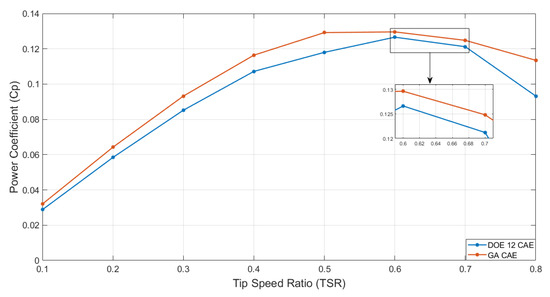 Finally, Figure 11 shows a comparison between the performance of the optimized design using the GA algorithm and the design with the best performance found during the DOE, which reached a maximum of at a of with a design of , , and mm. In this Figure, observe that the optimized design using the GA algorithm has superior performance to the best design found during the DOE throughout all the points. In particular: (1) there is an increase in of up to 9.49% at a of 0.5, (2) an increase of up to 21.78% at a of , and (3) an increase of 2.36% in the maximum at a of 0.6.