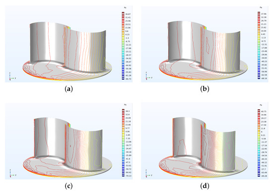 Pressure lines () on the lower half of the geometry of the GA-optimized Savonius wind turbine, (a) Instant pressure at , (b) Instant pressure at , (c) Instant pressure at , (d) Instant pressure at .