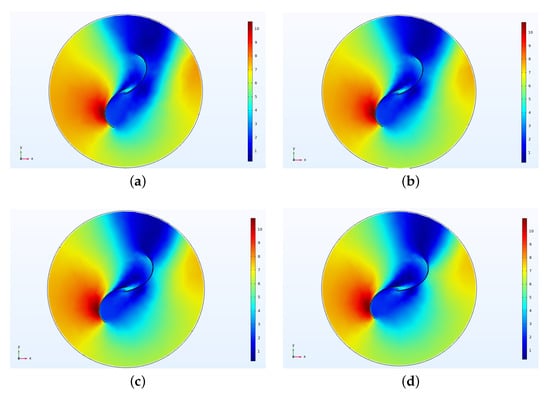 Wind speed (m/s) over the profile of the GA optimized Savonius wind turbine, (a) Instant speed at , (b) Instant speed at , (c) Instant speed at , (d) Instant speed at .