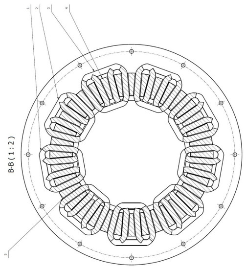 Position of elements included in the machine stator, seen from the top; 1—phase coil A, 2—phase coil B, 3—phase coil C, 4 or 5—magnetic material element that comprises the stator core.