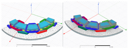 The investigated machine in the variant described herein includes symmetric pole pitches. Due to the fact that phase winding coils interlace each other in the front part, which is shown in Figure 3, in order to correctly reflect in computations the phenomena that take place in this area, it is necessary to make analyses for the model that includes pole pitches. Figure 4 presents the adopted model together with the comparison of finite element meshes generated for the magnetic field error comprising, respectively and .