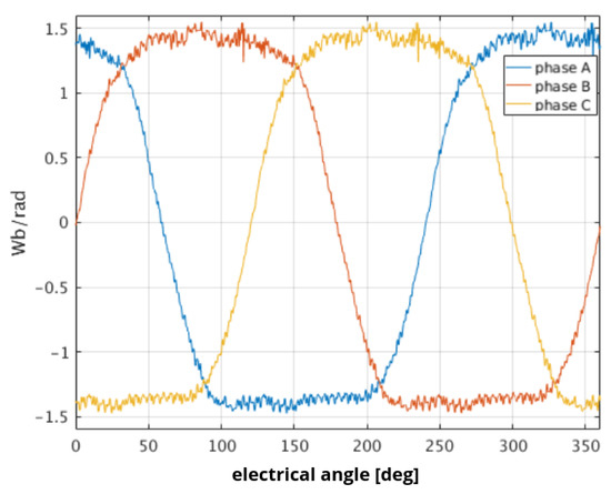 The proposed method of rotor angular speed estimation and the angle of rotation makes use of the Jacobian matrix [39,40] formulated according to the following dependency (8). The values of magnetic flux derivatives from permanent magnets coupled with stator winding are expressed in a time-invariant system . After multiplication by the generator rotational speed , they provide constituents of the induced voltage.
