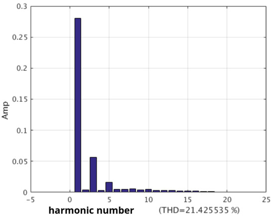 The large THD from the derivative waveform from the magnetic flux in Figure 7 applies to the generator phase voltage. This is intentionally caused by the insertion of the material of high magnetic permeability shown in Figure 2. The purpose is to allow a more accurate estimation of the machine speed. This high THD is caused by the third harmonic of the magnetic flux. Therefore, it is not noticeable in the inter-phase voltage, which is visible outside the generator. There is no risk of exceeding the voltage quality indicators, as stated in the standards.