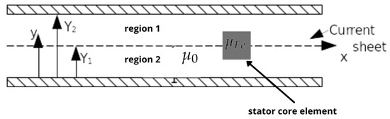 In order to conduct a comparative study, as well as for validation purposes, the magneto static calculations have been repeated using a simplified, hybrid analytical–numerical method. In order to determine induction coefficients, the stator coils are represented by an infinitesimally thin layer for which current flow is defined by using the Fourier series decomposition in such a way so as to reflect the location of coils in a particular phase. In the next step, the Laplace equations are solved for each harmonic in a set considered in an approximated Fourier decomposition, separately in regions 1 and 2. The schematic view of the analytical model is presented in Figure 8.