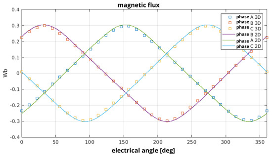 The Back-EMF waveforms are determined by calculating the derivatives of magnetic fluxes with respect to the rotor position angle . The results presented in Figure 11 can be compared with these in Figure 6, which are obtained using full 3D FEM analysis.