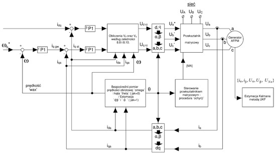 In this section, we present a control system capable of taking advantage of the features of the designed construction in order to estimate current values of working parameters ( and ) and to use them in the control process. Figure 12 presents an overall schema of the control system. A detailed description of the methods implemented in block “Estimation / measurements block” is presented in the next section. The description of methods implemented in a “Matrix converter controller” is beyond the scope of this paper.