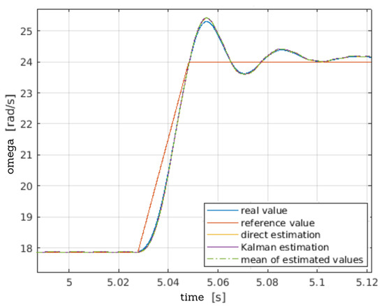 The acquired results indicate that both in the case of utilizing Kalman filter and the proposed method of direct estimation, the variability of the value of rotational speed is slightly overestimated in dynamic states. None of the compared estimation methods exhibit a greater tendency to error in this respect. Figure 15 presents a comparison of the estimation results of the machine rotational speed in the case of stabilization of its performance after a change in the value of the given rotational speed.