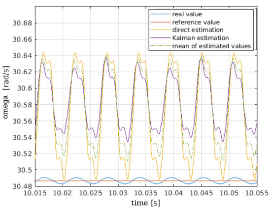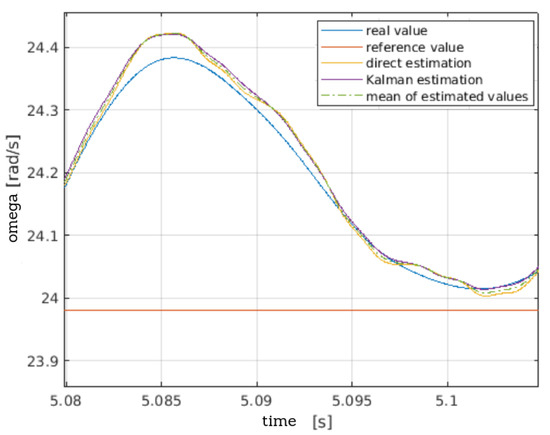 The acquired results indicate that both in the case of utilizing Kalman filter and the proposed method of direct estimation, the variability of the value of rotational speed is slightly overestimated in dynamic states. None of the compared estimation methods exhibit a greater tendency to error in this respect. Figure 15 presents a comparison of estimation results of the machine rotational speed in the case of stabilization of its performance after a change in the value of the given rotational speed.