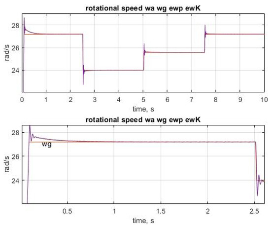 The acquired results prove that both methods provide very high accuracy of estimation of the rotor rotational speed value in dynamic states. For the purpose of further assessment of the accuracy of results provided by the proposed method of direct estimation, it is necessary to take a closer look at the results of simulation. Figure 14 presents results of the same computations, enabling to approximately assess the behavior of the estimated values with regard to the real values of rotor rotational speed.