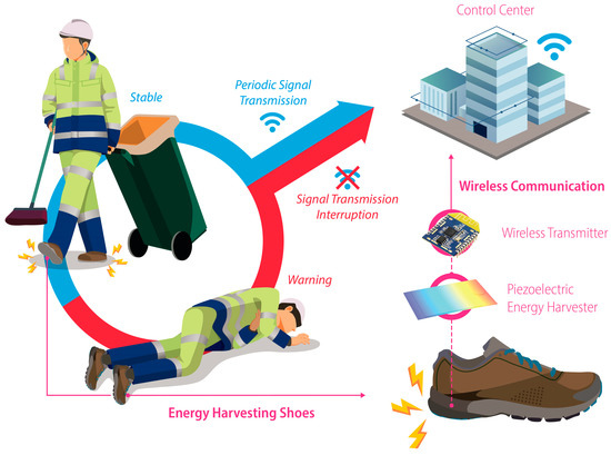 The PEH is embedded in the sole of a shoe and generates electricity in response to user movements. The electrical energy accumulated is then used to power a wireless communication system as a self-powered wearable device. If the user continues to move, the wireless transmitter is driven by power generated from the PEH by transmitting a periodic signal to the receiver in a control center. Conversely, if the user is in an accident, and there is no user movement, the PEH will not generate power or run the wireless transmitter. If the receiver does not receive a worker’s signal for more than a certain period of time, it is judged to be a dangerous situation and informs the administrator of the risk. This is a system that is directly related to the safety of at-risk workers, so the scope of its application is endless.