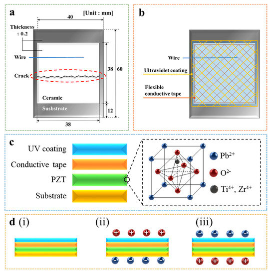 (a) Piezoelectric device with a crack, (b) Piezoelectric device with conductive tape and ultraviolet coating, (c) Layers constituting a piezoelectric device and a perovskite PZT unit cell, (d) Direction (polarity) of the voltage formed by default state (i), compression (ii) and release (iii).