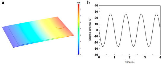 (a) Total displacement of the piezoelectric device in millimeters, (b) Open-circuit voltage across the piezoelectric device.