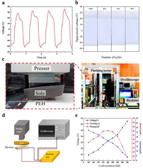 A subject weighing 60 kg put on our energy harvesting shoes and walked at normal speed for this experiment. Figure 5a shows the open-circuit voltage generated by the PEH, which shows good agreement with numerical study results shown in Figure 4b. Because the PEH is located inside the shoe, it must be able to withstand the weight of the human body; therefore, the durability of the PEH had to be evaluated. Durability testing was carried out using a pushing tester (Figure 5b) to describe the force exerted when the subject walks in the shoes with the PEH inserted under the insole. The same force was applied repetitively to the PEH using the pushing tester. The waveform of the open-circuit voltage was measured for given numbers of bendings (20 k, 40 k, and 60 k times), as shown in Figure 5c. The initial open-circuit voltage of the PEH was 60 V, which dropped to 57.2 V after 60,000 cycles (full compression and release). Thus, the voltage of the PEH dropped by 0.78% every 10,000 cycles. The resistive matching point of the PEH in the shoe was measured. The highest power was measured while increasing the variable resistance; a value of 52 μW was obtained at 280 kΩ (see graph in Figure 5d,e).