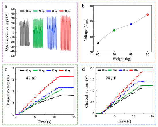 (a) Open-circuit voltage waveform and (b) Maximum voltage according to the weight of the object, (c) Charged voltage with a capacitor with 47 μF and (d) With 94 μF.