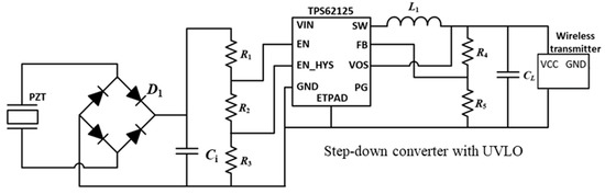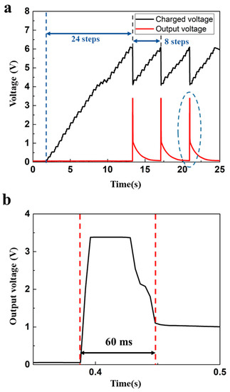 The energy generated by the PEH is used to power a wireless transmitter. The amount of energy generated with one cycle (compress-release) by the PEH is insufficient to operate the wireless transmitter. Therefore, a specific circuit is required to store enough energy in a capacitor to operate the wireless transmitter, and then transfer power from the capacitor to the wireless transmitter when enough energy has been gathered to operate it. Figure 7 shows a schematic of the wireless communication system consisting of a rectifier, a step-down converter with under-voltage lockout (UVLO) function, and a wireless transmitter (AK-J027, Shenzhen Century Aoke Electronics Co., Ltd., Shenzhen, China). The voltage generated by the piezoelectric device is rectified through a rectifier and the energy generated is accumulated in the capacitor (Ci). Initially, the UVLO function turns the device into shutdown mode, and no current flows into the load, and energy is continuously charged to Ci. When the voltage of Ci rises and reaches the level, the circuit becomes active and the current charged in Ci flows to the load. When the voltage of Ci falls below the level, the circuit returns the device to shutdown mode again. In this way, it is possible to periodically operate the wireless transmitter by serially collecting sufficient power. In this circuit, the voltages and were set to 6 and 4 V, respectively, and the output voltage was 3 V. After 24 steps, the capacitor is charged with enough energy to send a signal to the receiver, as shown in Figure 8, and the transmitter run time is 60 ms (Figure 8b). After starting the device once, it is possible to operate the wireless transmitter again after 8 steps.