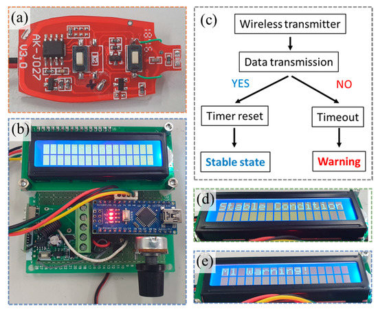 (a) Transmitter, (b) Receiver of the wireless communication system, (c) Diagram of the operating algorithm of the wireless communication system. LCD screen with (d) Stable and (e) Warning conditions.