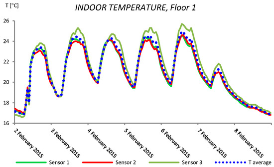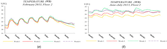 In June–July, the temperature is closely related with the exterior weather conditions, while in February temperature profiles are more regular because the heating system is working according to the energy consumption of Figure 11.