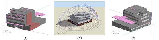Rectorate west block model in DB: (a) SE view; (b) building shading with the sun position; (c) NW view.