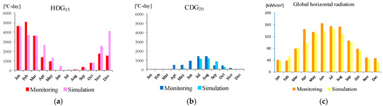 Comparison between simulation weather data from monitoring (meteorological station) and simulation (EPW file): (a) heating degree days; (b) cooling degree days; (c) global horizontal radiation.
