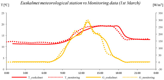 Blackouts have been filled by taking the missing information from Euskalmet (Basque Meteorology Agency). To verify the suitability of the Euskalmet data, days on which monitored data were available were randomly selected. Then, the monitoring and Euskalmet data from those days were compared; the results showed minor differences (Figure 5), so the weather file was completed with the data from the Basque Meteorology Agency’s measurements.