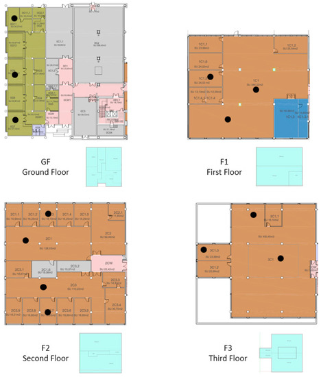 Figure 7 shows the floor plans and the uses of the WB of the building, which are represented with different colours. The Rectorate is mainly an office building (brown), but on the ground floor there is a nursery (green). There are also various rooms used as storage rooms (grey), passage areas (pink) and a place where the servers of the UPV/EHU (blue) are located.