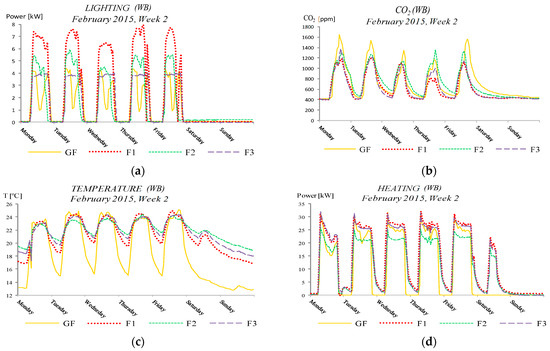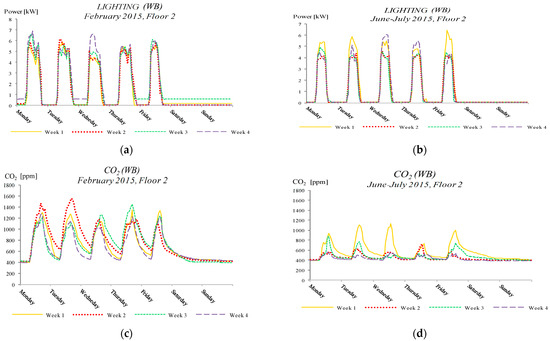 In order to know if the weekly operational pattern in a floor is repeated over time, on all floors a four-week analysis was conducted floor by floor. In Figure 10, the monitoring data (lighting energy consumption, CO2 concentration and temperature) of the second floor has been plotted as an example to compare heating and non-heating periods. The results of this analysis show whether the week chosen is suitable to calibrate each operational season. For heating period analysis, 4 weeks of February were chosen, and for non-heating season the last 2 weeks of June and the first two of July were selected in order to analyse the building energy performance with a high occupancy rate. It must be taken into account that occupation should be lower in July and August due to vacations.