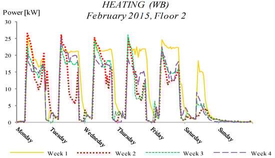 It is notable that heating consumption is higher during the coldest week (week 1). In the morning, there is always a need to warm up the building, which is why the consumption is similar during all weeks. However, higher differences have been found in the afternoons because different power is required to maintain the indoor temperature, depending on the outer temperature conditions.