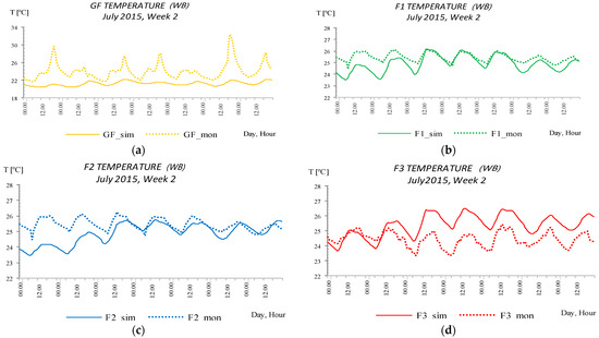 Simulated (sim) and monitored (mon) temperatures for the summer typical week: (a) GF; (b) F1; (c) F2; (d) F3.