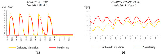 Summer typical week simulation results and monitoring measurements of the WB of the Rectorate (GF excluded): (a) lighting consumption; (b) temperature.