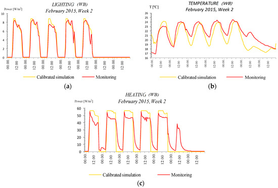 Once similar temperatures are obtained for simulation and monitoring in a typical summer week, winter week illumination and temperature are checked (building averaged). In this case, heating power was also studied (Figure 14).
