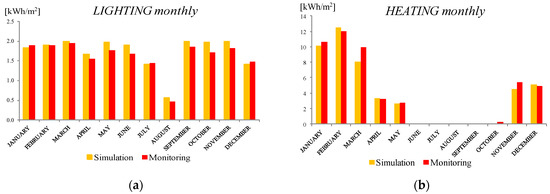 Figure 15. Prorated monitoring and simulation data comparison during year 2015: (a) lighting consumption; (b) heating consumption.