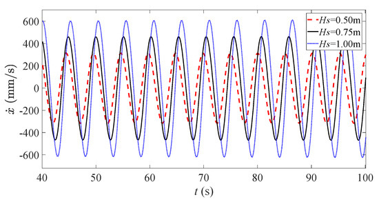 Velocity–time curves of three different wave heights for a wave period of 5 s.
