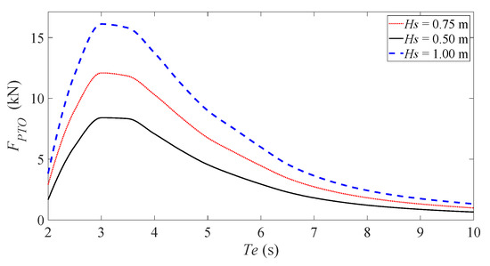 According to Equation (10), the optimal damping force of the PTO can be derived by the multiplication of the heave velocity in the stable period of the floater under different regular waves with the optimal PTO damping. Figure 6 depicts the maximum value of the PTO damping force. As seen from the figure, when the wave period is 3 s, achieves the maximum value. At this period, the wave frequency is 2.08 rad/s, and it can be seen from Figure 4a that the motion response of the floater is the most intense at this frequency. When is 1 m, the maximum value of reaches 16,110 N, and when is 0.75 and 0.5 m, is 12,090 and 8407 N, respectively. As the period increases to 10 s, tends to 0. Obviously, the larger the wave, the greater the requirements of the floater on the optimal damping force of the PTO to maximize energy absorption.