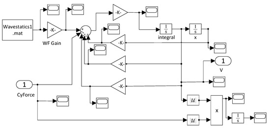The hydrodynamic parameters obtained from the above calculation are used as the design input of the Simulink model to build a hydrodynamic model for co-simulation with AMESim. Simulink implementation of the dynamic equation of the heaving floater is shown in Figure 7.
