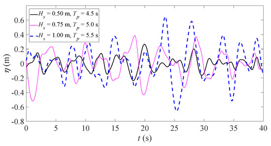 The irregular waves vary in frequency, amplitude, and direction from time to time. Thus, real sea waves are investigated in a statistical way using so-called power spectra [17]. In this study, three sea states were analyzed ((A: is , is ), (B: is , is ), (C: is , is )).