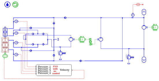 In order to prove the effectiveness of the hydraulic system, a complete model without a control strategy is established in the co-simulation environment, which is the combination of AMESim and MATLAB/Simulink software, as shown in Figure 10.