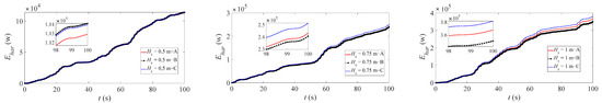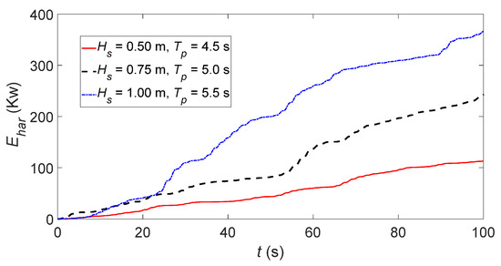 It is seen from Figure 11 that the maximum displacement of the floater at the sea state C during 20 and 60 s is about −0.9133 m, with the sea state A and B at −0.7171 and −0.3125 m, respectively. Figure 12 compares the absorbed energy of the floater at three different sea states during the computation time of 100 s. At 100 s, the absorbed energy of sea state C reaches 366 kW, while the absorbed energy of sea states A and B are 241.8 and 112.8 kW, respectively. It is worth noting that the more severe the sea conditions, the stronger the floater’s motion response, and the more energy harvested.