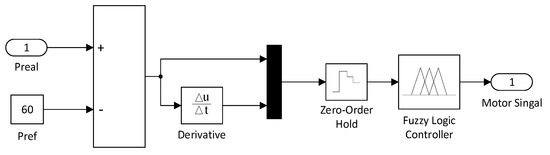The purpose of this task is to adjust the inlet pressure of unit 7 (Figure 2) according to the pressure measured in the pipeline by adjusting the angle of the swash plate [24]. An adaptive controller based on intelligence, such as fuzzy, is suitable for this case. As presented in Figure 13, the control was optimized to reduce the error between the reference and the real pressure .
