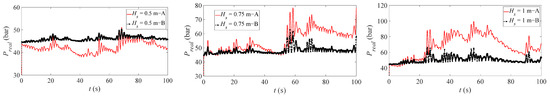 The optimal coefficient of Equation (18) is closely related to the dynamic of the system. When the value of increases, the increase of causes the transformer circuit to absorb a large number of pressure peaks, resulting in a more stable circuit pressure. However, it will also stop the hydraulic cylinder from moving in the case of small waves. In order to find the optimal parameter , the efficiency of PTO , the harvested energy and the pressure stability of the generated circuit should be taken into account. In the calculation, the stability of pressure can be evaluated by the change of pressure: